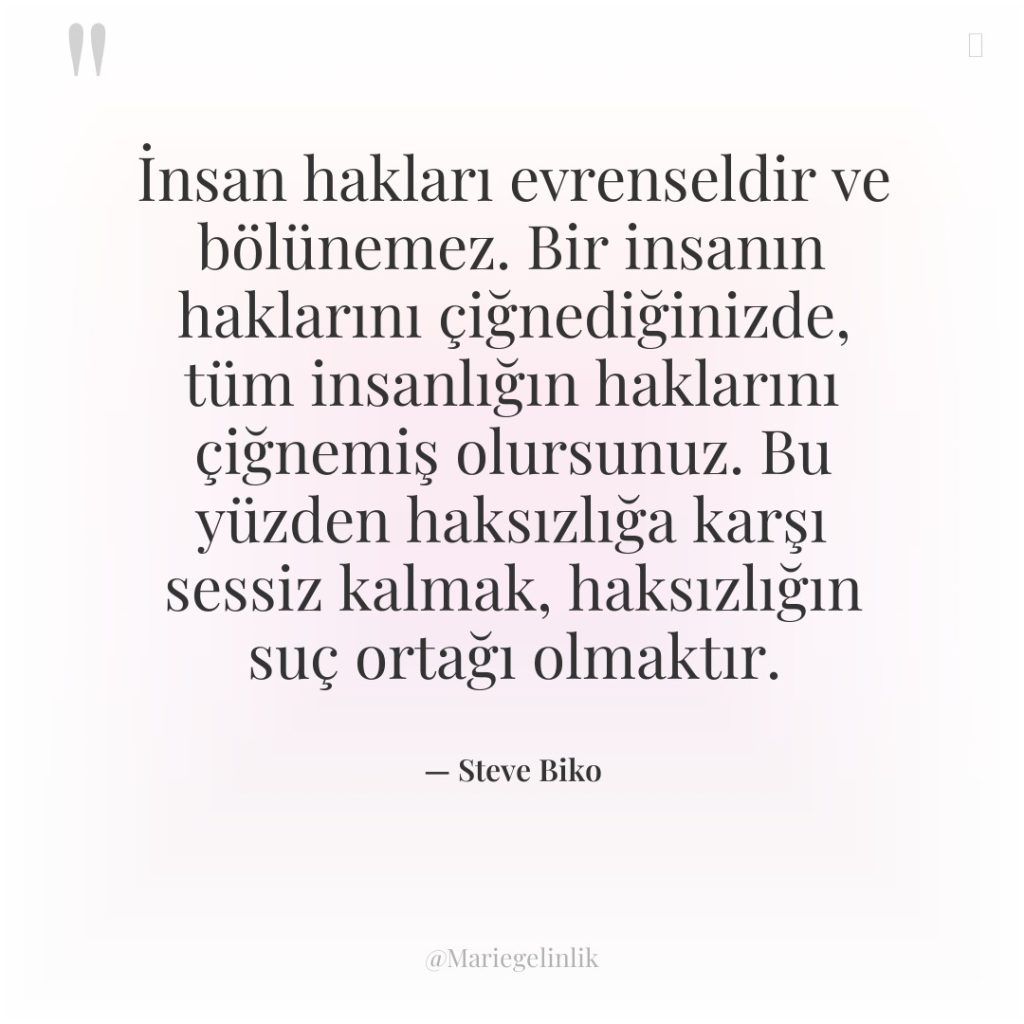 İnsan hakları evrenseldir ve bölünemez. Bir insanın haklarını çiğnediğinizde, tüm insanlığın haklarını çiğnemiş olursunuz. Bu yüzden haksızlığa karşı sessiz kalmak, haksızlığın suç ortağı olmaktır.